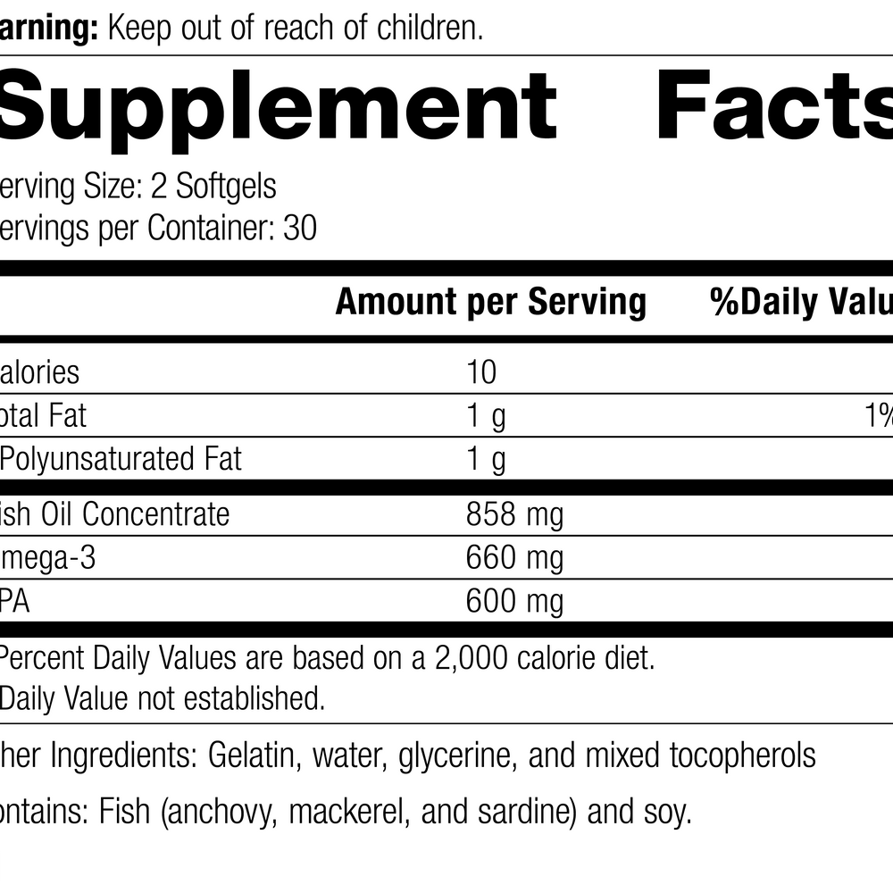 Each Serving Size (2 Softgels) contains: Calories 10, Total Fat 1 g, Polyunsaturated Fat 1g, Fish Oil Concentrate 858 mg, Omega-3 660 mg, EPA 600 mg. Other Ingredients: Gelatin, water, glycerine, and mixed tocopherols. Contains: Fish (anchovy, mackerel, and sardine) and soy.