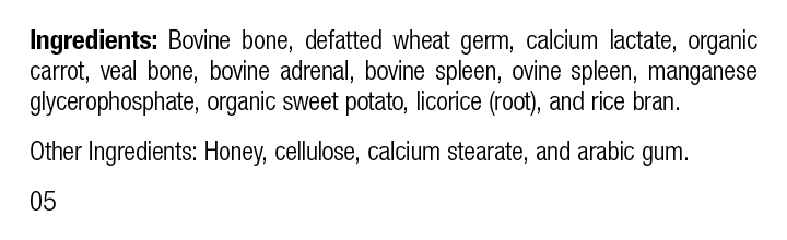 Each Serving Size (1 tablet) contains: Ingredients: Bovine bone, defatted wheat germ, calcium lactate, organic carrot, veal bone, bovine adrenal, bovine spleen, ovine spleen, manganese glycerophosphate, organic sweet potato, licorice (root), and rice bran. Other Ingredients: Honey, cellulose, calcium stearate, and arabic gum.